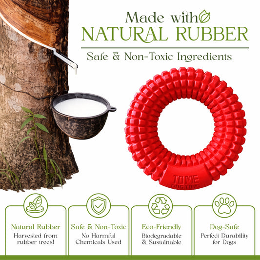 The non-toxic chew toys for dogs at Tome DogToys have natural materials, such as 100% high-quality vegetable rubber.